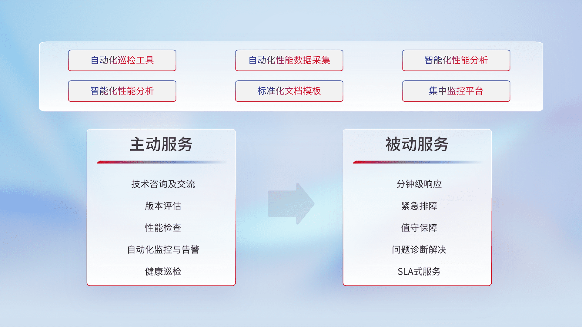 智能化工具和标准化文档,,,保障服务质量,,提供主动服务(包含技术咨询、、、版本评估、、、、性能检查、、、、自动化监控与告警、、、、健康巡检)和被动服务包含(分钟级响应、、、、紧急排障、、、、值守保障、、、问题诊断解决、、、SLA服务)。。
